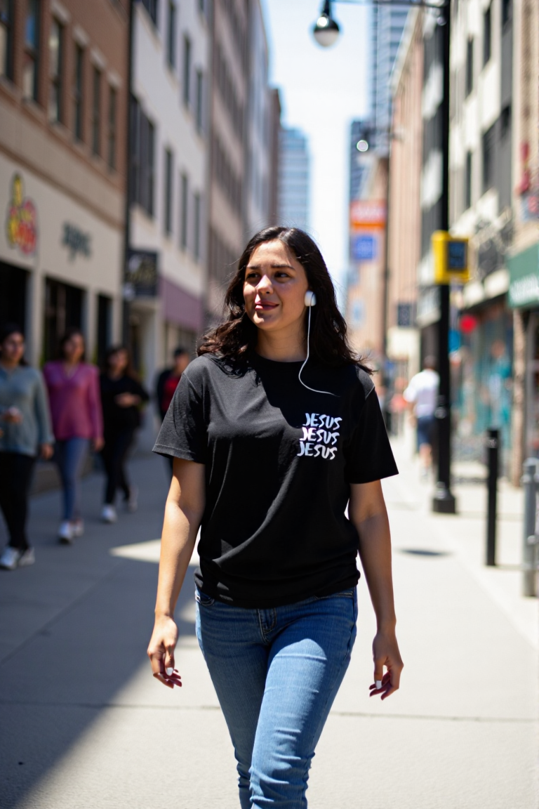 This black crew neck tee features a striking triple-stack of the name JESUS on the left chest—simple in design, powerful in message. The clean white typography stands out against the dark fabric, making it a versatile piece that speaks volumes without saying a word.